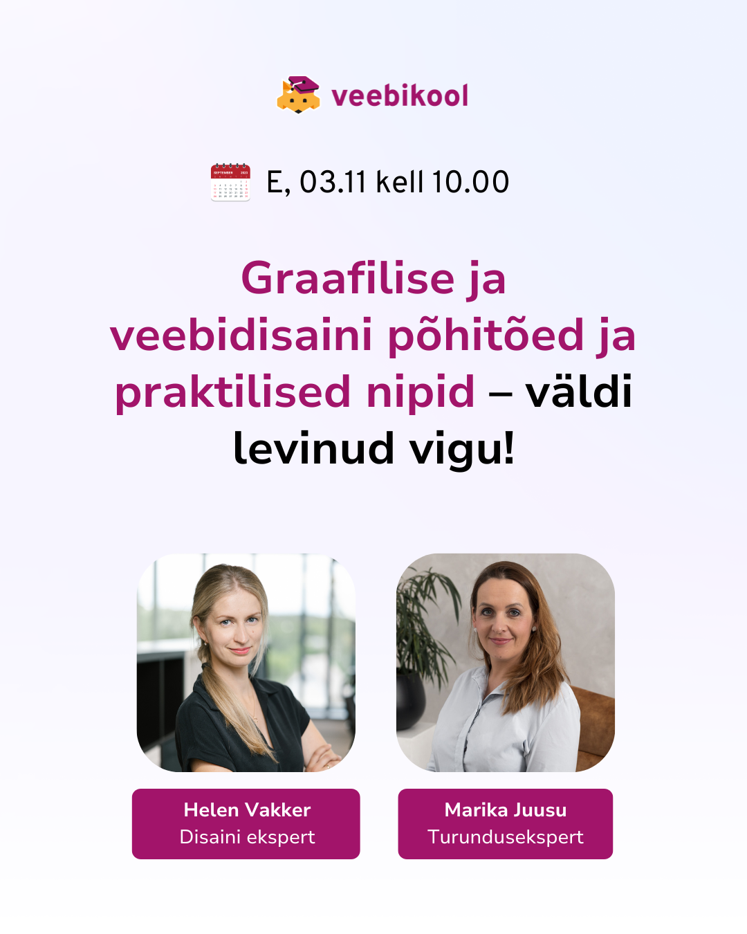 Koolitust viib läbi Helen Vakker, kellel on kogemus graafilise disaini, UX/UI ja WordPressi valdkonnas. Oma töös keskendub ta kasutajasõbralike lahenduste ja selgete brändiidentiteetide loomisele.